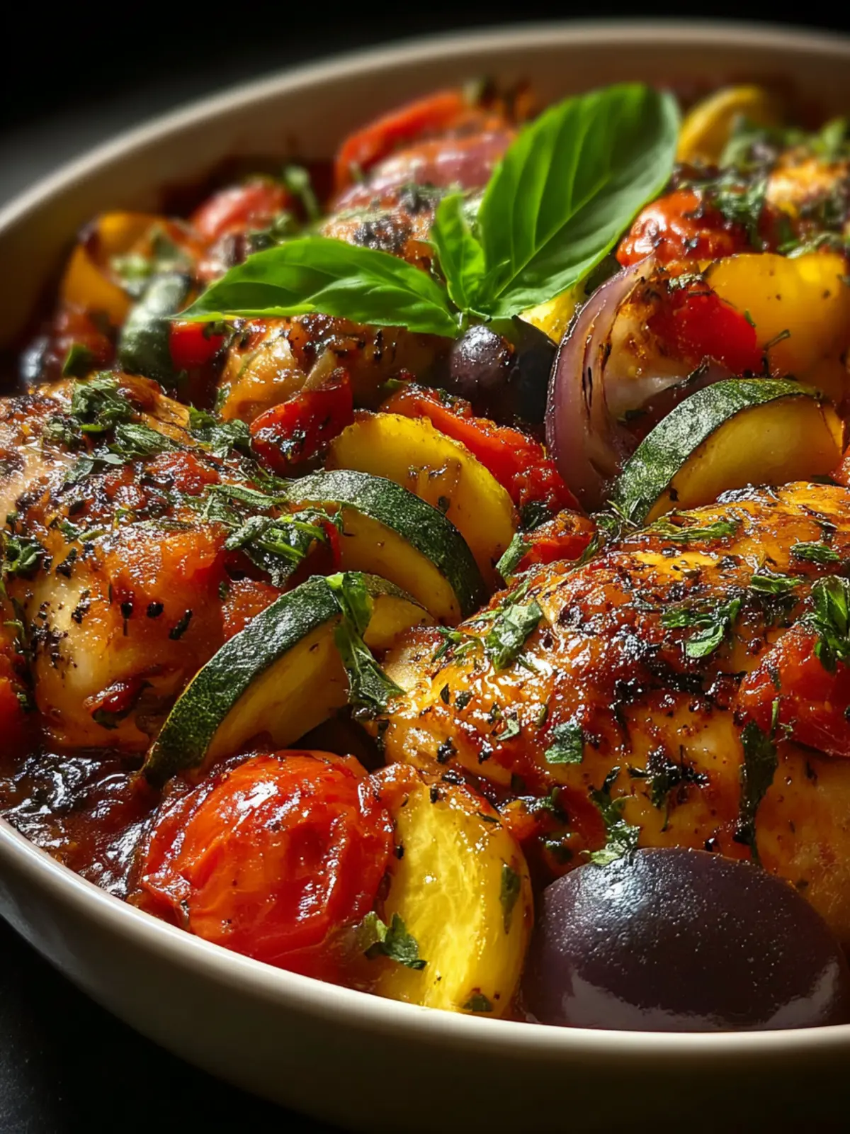Not only is this colorful ratatouille chicken bake a feast for the eyes and the palate, but it also offers convenience. The straightforward preparation and cooking process make it an ideal option for busy weeknights. You can easily toss everything in one pan and let the oven work its magic, freeing you to unwind after a long day.