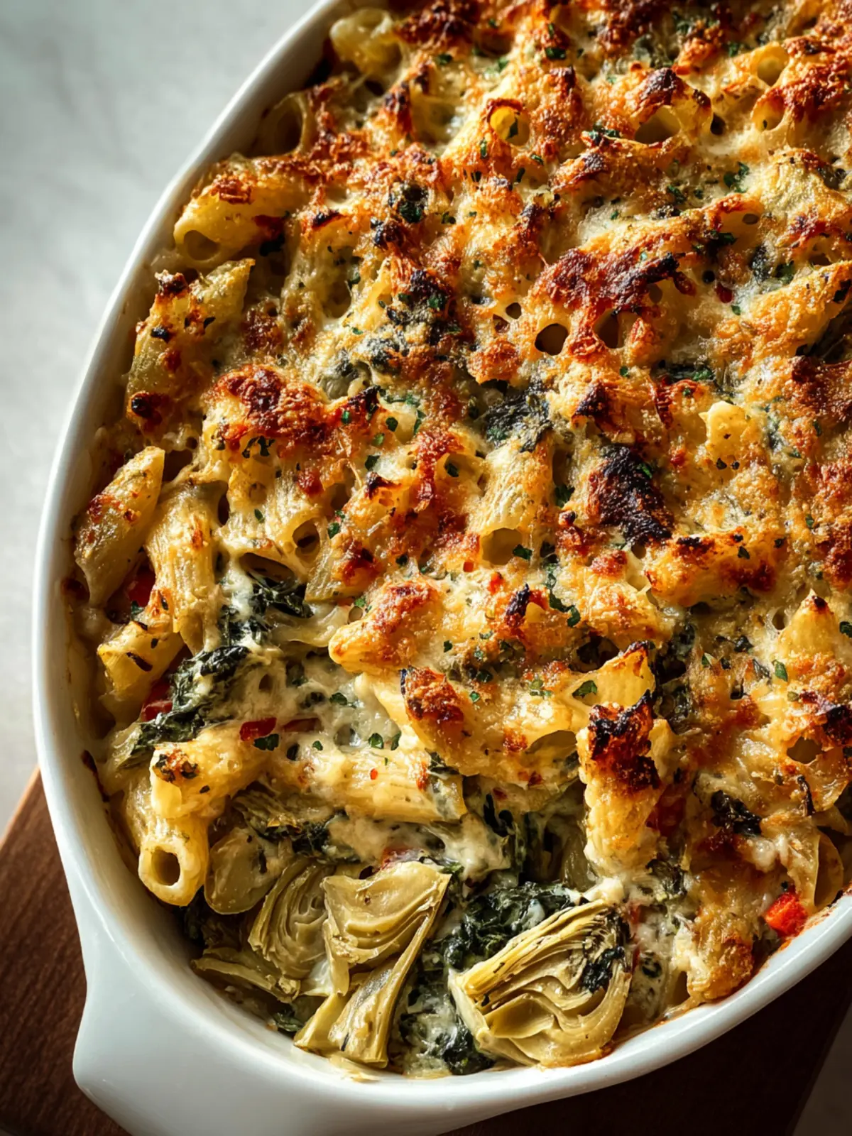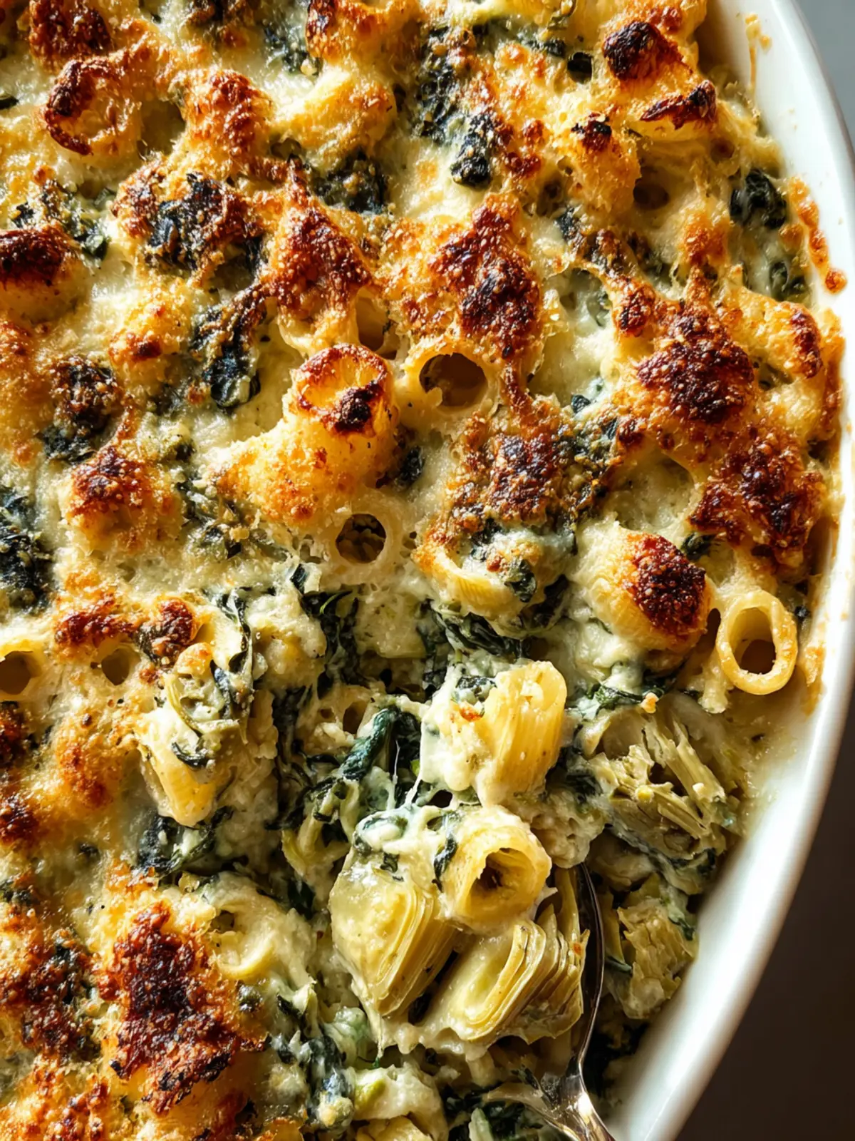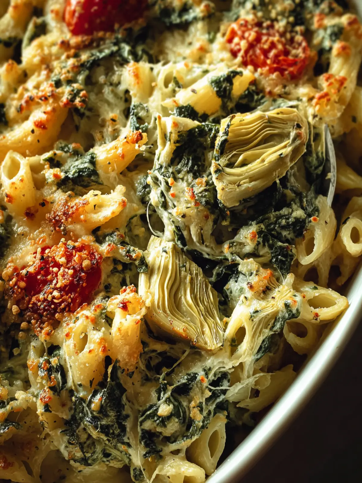 A deliciously creamy baked pasta with spinach and artichoke hearts, perfect for a cozy dinner.