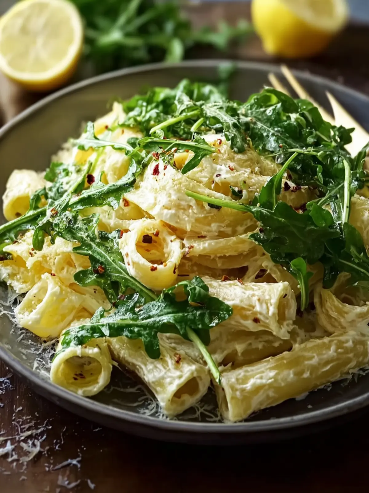 A light and creamy pasta dish featuring ricotta and fresh arugula, brightened with lemon and garlic.